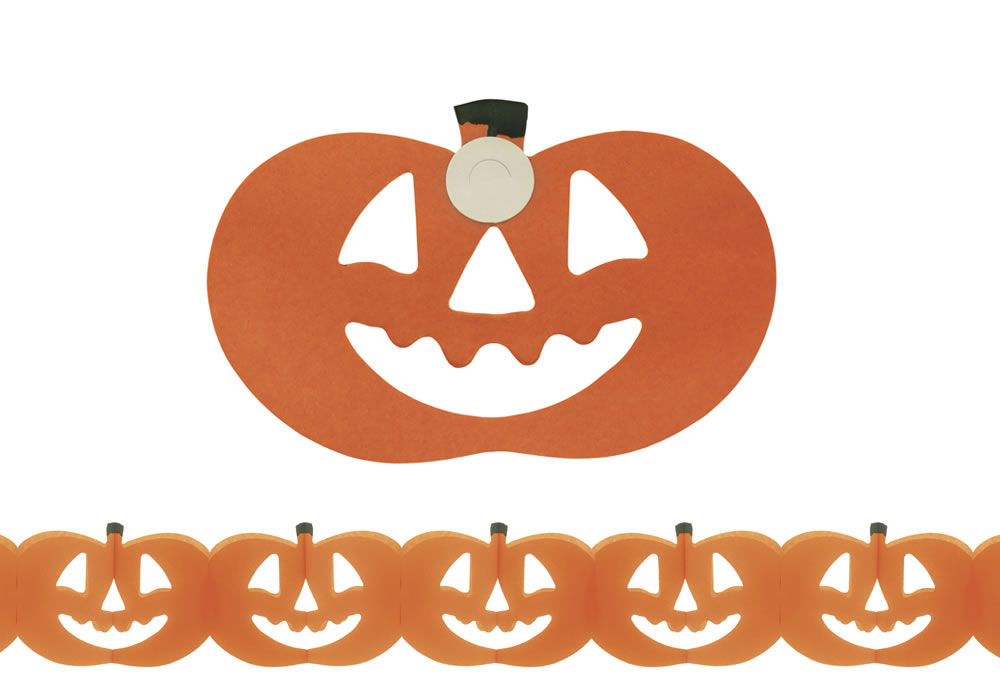 Guirnalda con forma de calabaza con rostro calado típica de las celebraciones de Halloween. Colores: naranja.